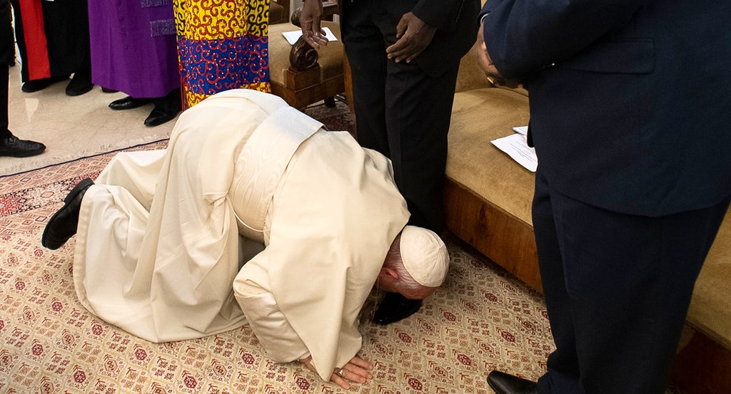 இவர்களிடத்தில் திருத்தந்தை மண்டியிட்டு பாதங்களை முத்தி செய்து அமைதிக்காக வேண்டினார்.